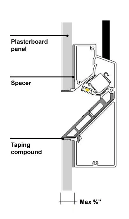 The fixture ships complete with an anodized aluminum front panel. It is also possible to achieve a seamless appearance by fabricating the front panel with the same material that is applied to the wall.